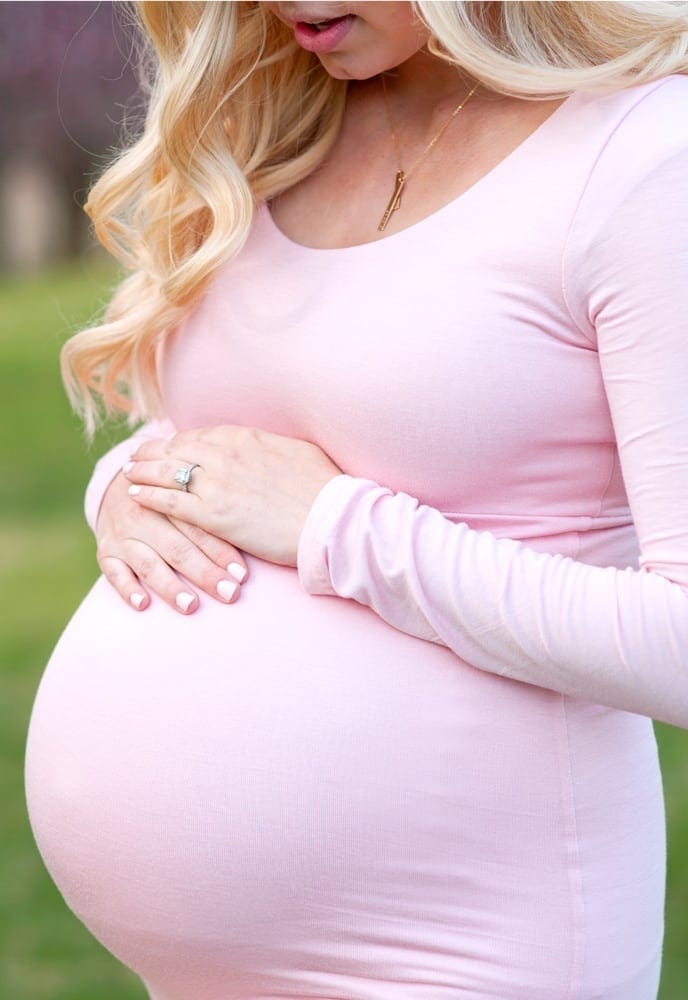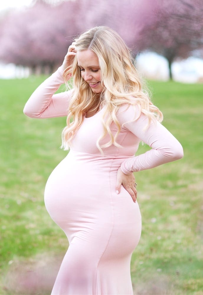 This long-sleeve scoop-neck fitted maternity gown with a flare bottom is a modest maternity gown that exudes classic beauty. The dress is premium stretch material that provides equal parts comfort and style. Because it has a closed front it is perfect for your maternity photoshoot or any special occasion. (Pictured in Blush Pink.)