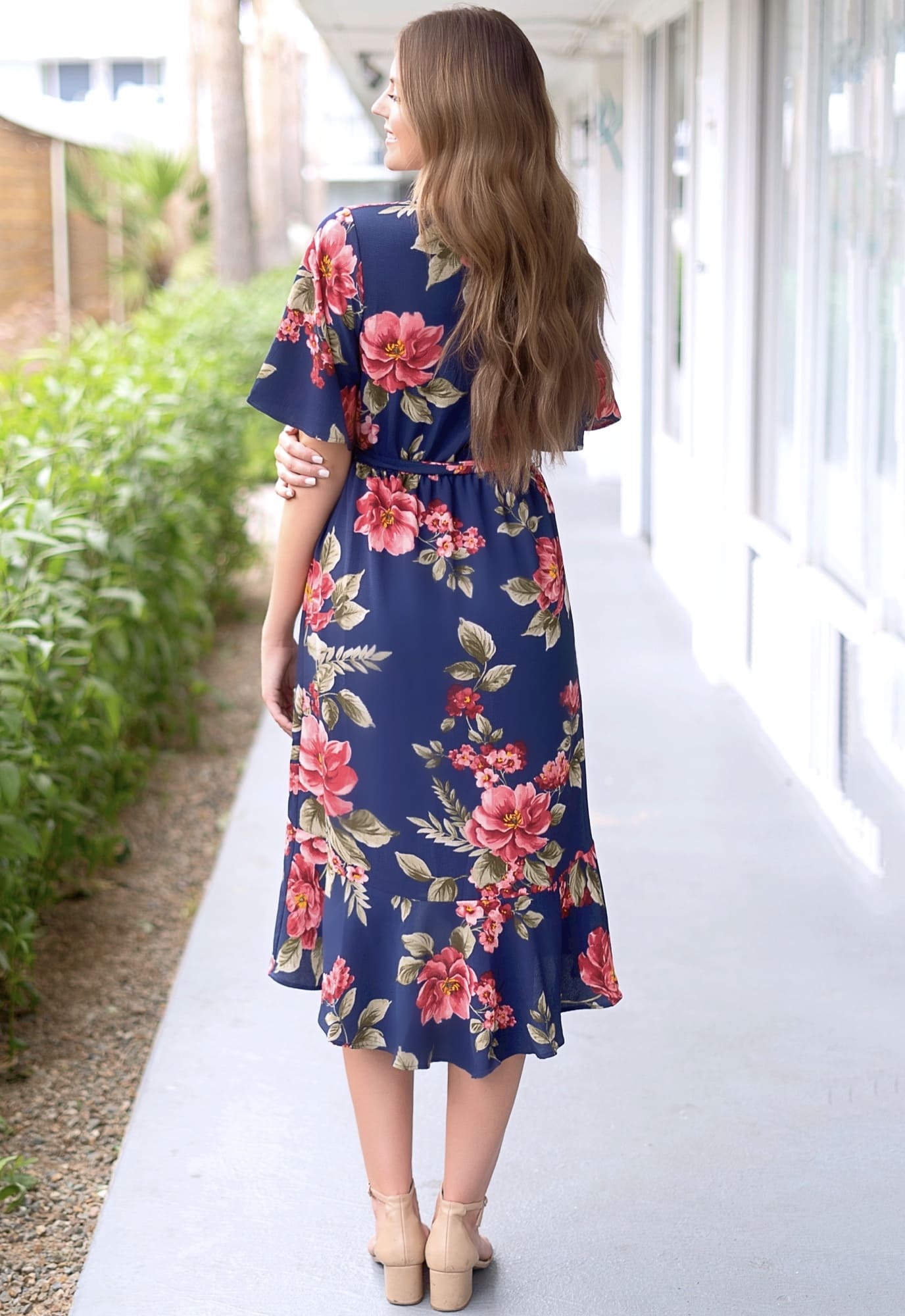 This gorgeous navy floral wrap dress showcases a stunning base with pops of rich color! Navy and coral floral print with a tie to go around your waist, this dress is flattering on any mama. Great for a lunch date, photoshoot, or everyday wear. This navy floral wrap dress is perfect for every occasion!
