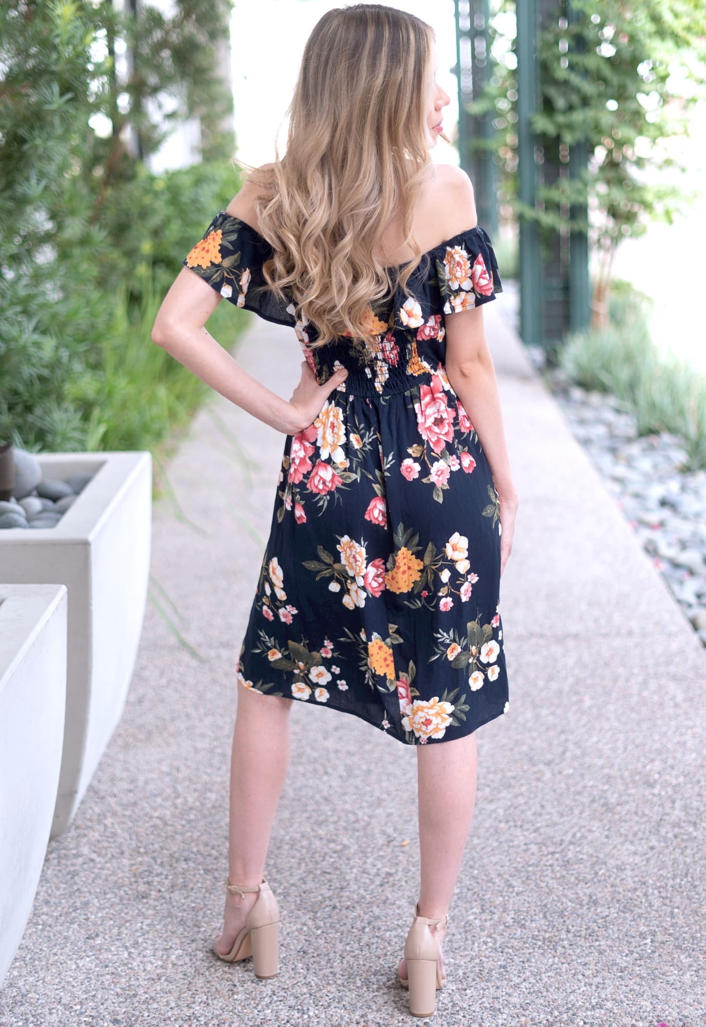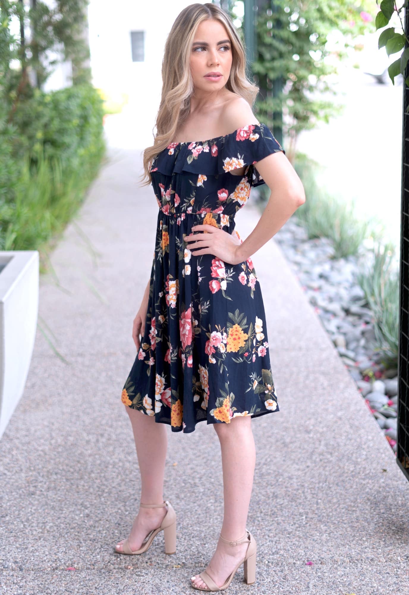 This floral navy off the shoulder dress is classic floral perfection. Constructed of stretch ruffle band and an additional smocked back to create the ultimate combination of comfort and style. Fitted until the under bust and then opens to a flowy fit. A total win for every Mama’s wardrobe!