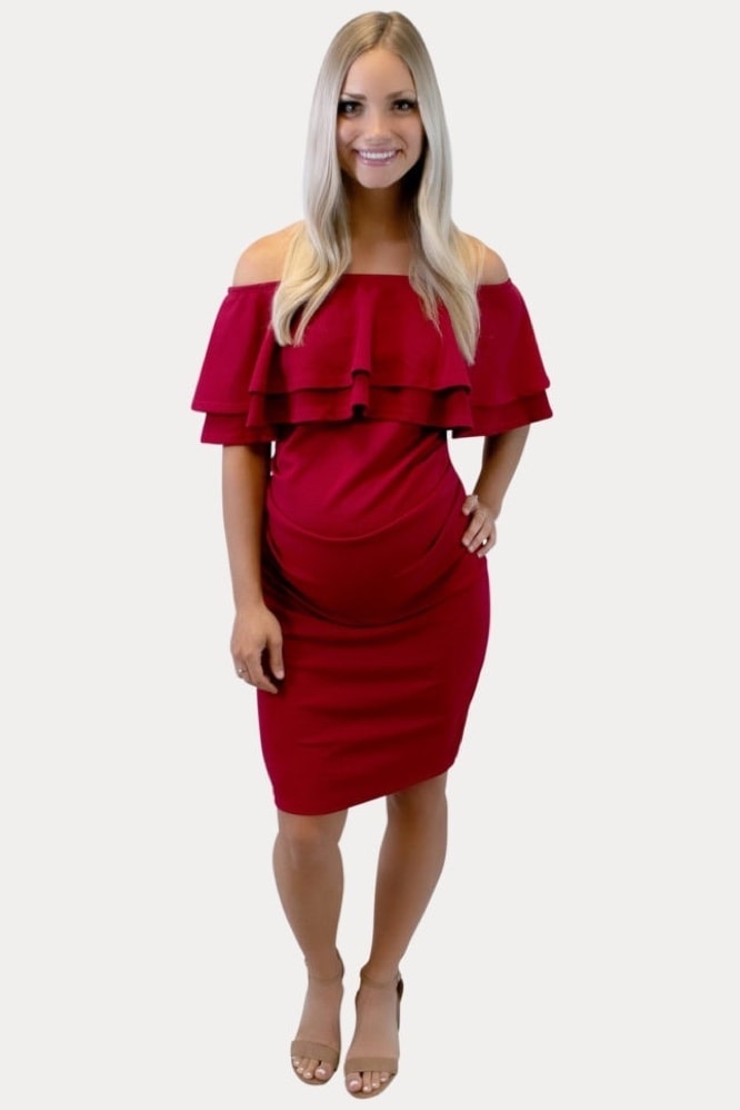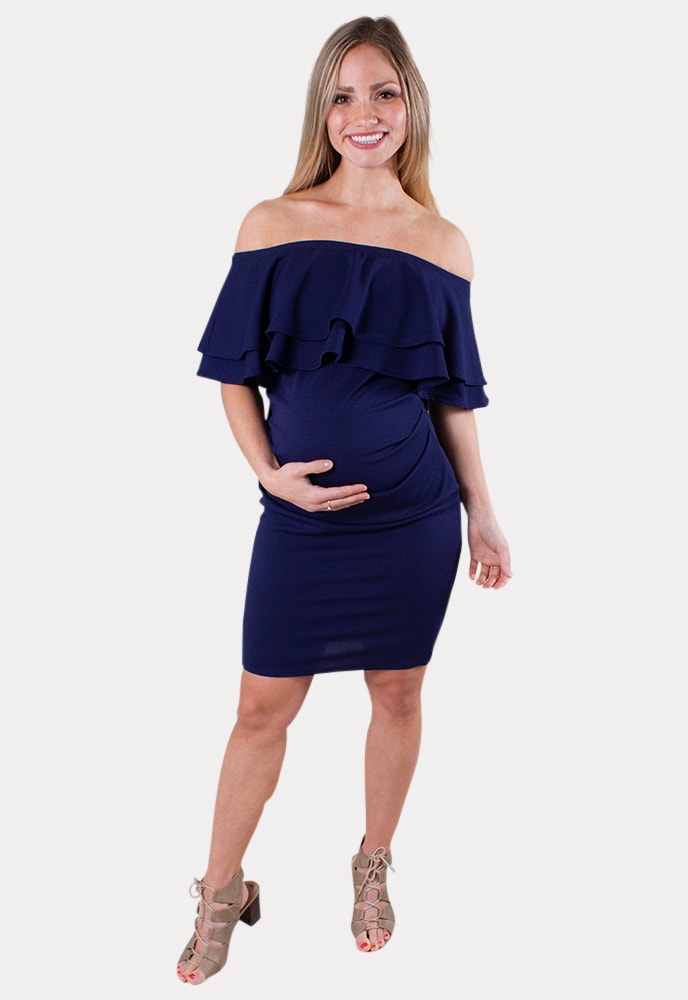 The Double Ruffle Off the Shoulder Dress was created for all you trendy Sexy Mamas! Constructed from a textured stretchy fabric, designed specifically with mama curves in mind. This off the shoulder maternity mini dress hugs all the right places and still leaves a smooth, flattering appearance. Perfect for day or night and a popular choice for a casual baby shower. Designed for wear throughout all nine months of pregnancy and beyond!