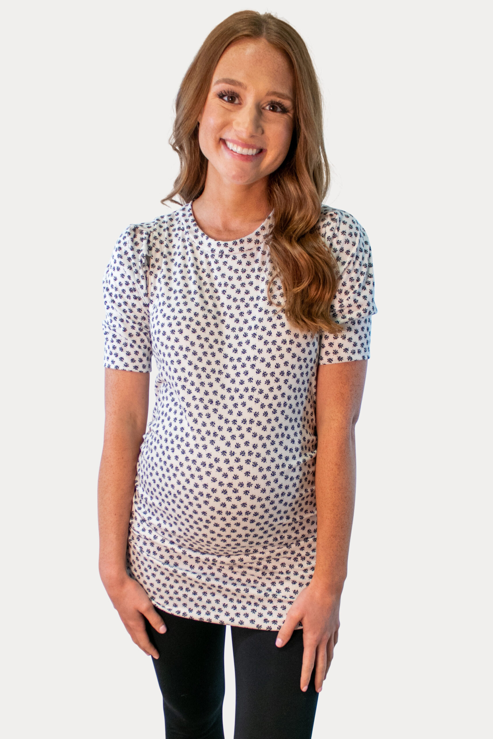 This white and black dressy maternity top screams fun! A must have for every mama’s wardrobe. Features puff sleeves, high neckline and a stylish print. This work friendly top is also perfect for any event or outing. Pairs great with any Sexy Mama bottoms or skirts! Ideal to wear throughout all nine months pregnancy and beyond!