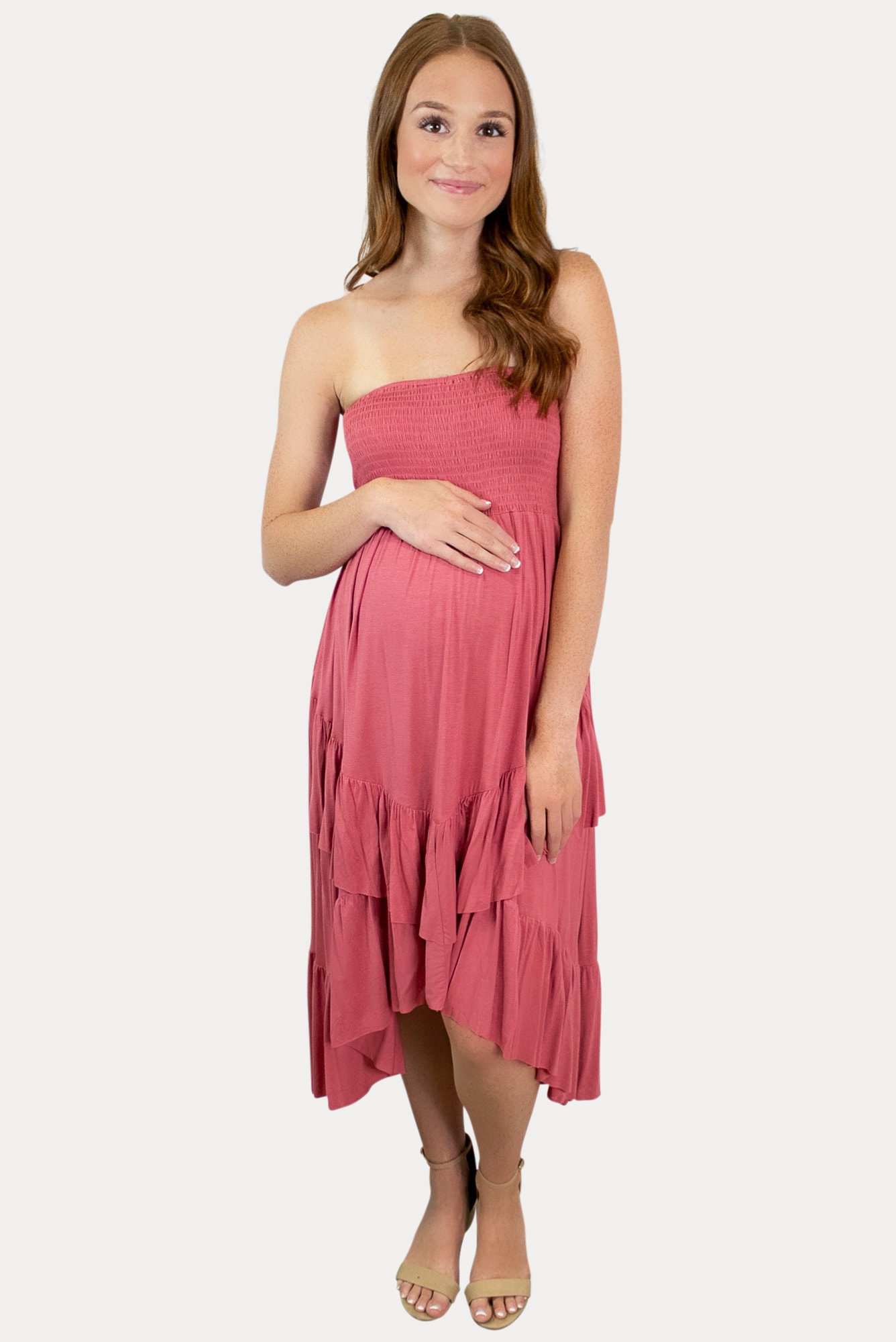 Our Peony layered pregnancy dress is one of a kind! Featuring a smocked fitted top with a looser fitting ruffled bottom in a pretty pink color. Style doesn’t mean you have to sacrifice comfort with this dress! Perfect for daily wear, baby shower, or a photoshoot. Designed for wear throughout all nine months of pregnancy and beyond!