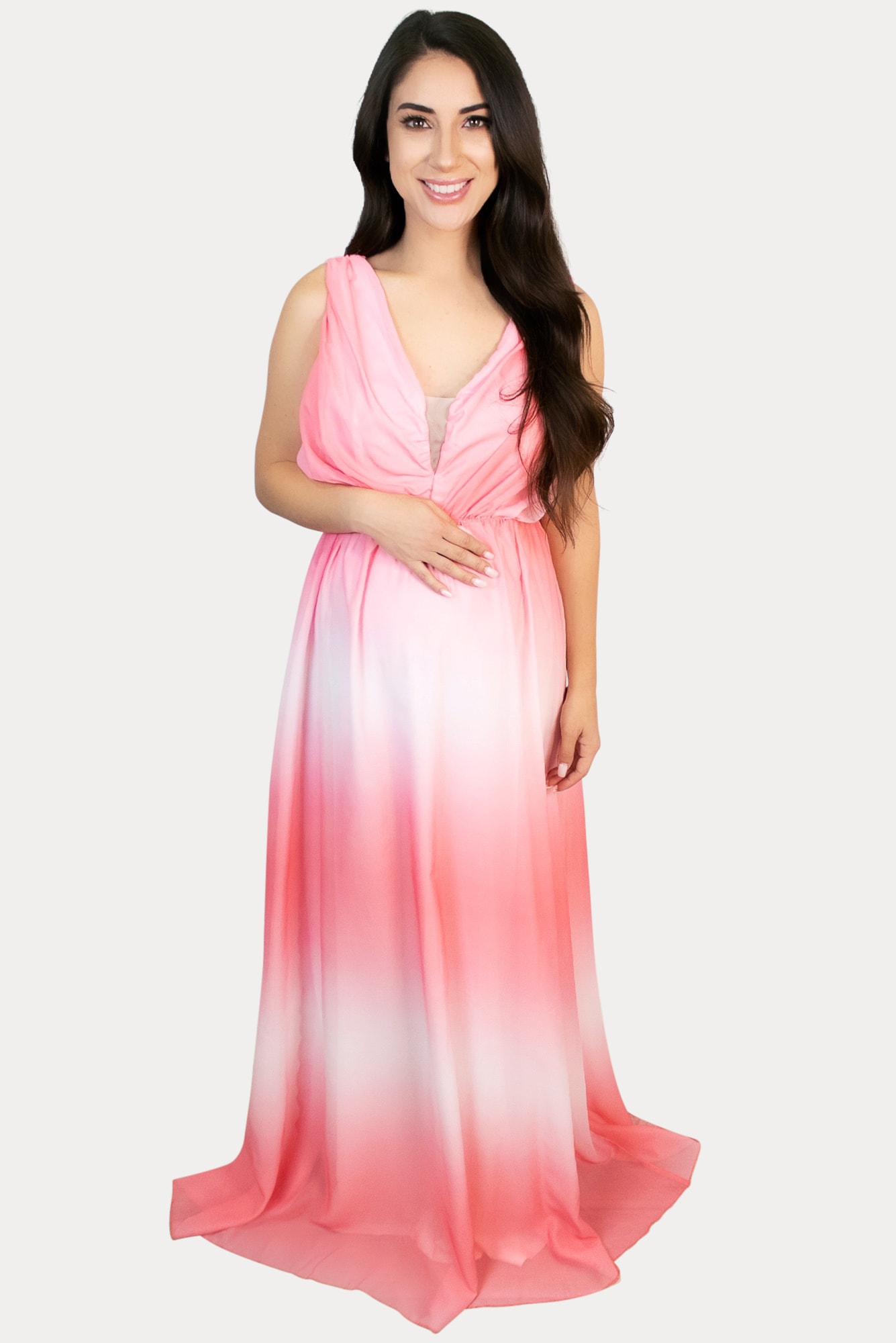 This lightweight, sleeveless pink ombre maternity maxi is sure to flatter every mama to be! Features a beautiful ombre pattern and a stunning deep V neckline. Great for a baby shower, gender reveal, or everyday wear. This maternity maxi dress is perfect to wear throughout all nine months of pregnancy and beyond.