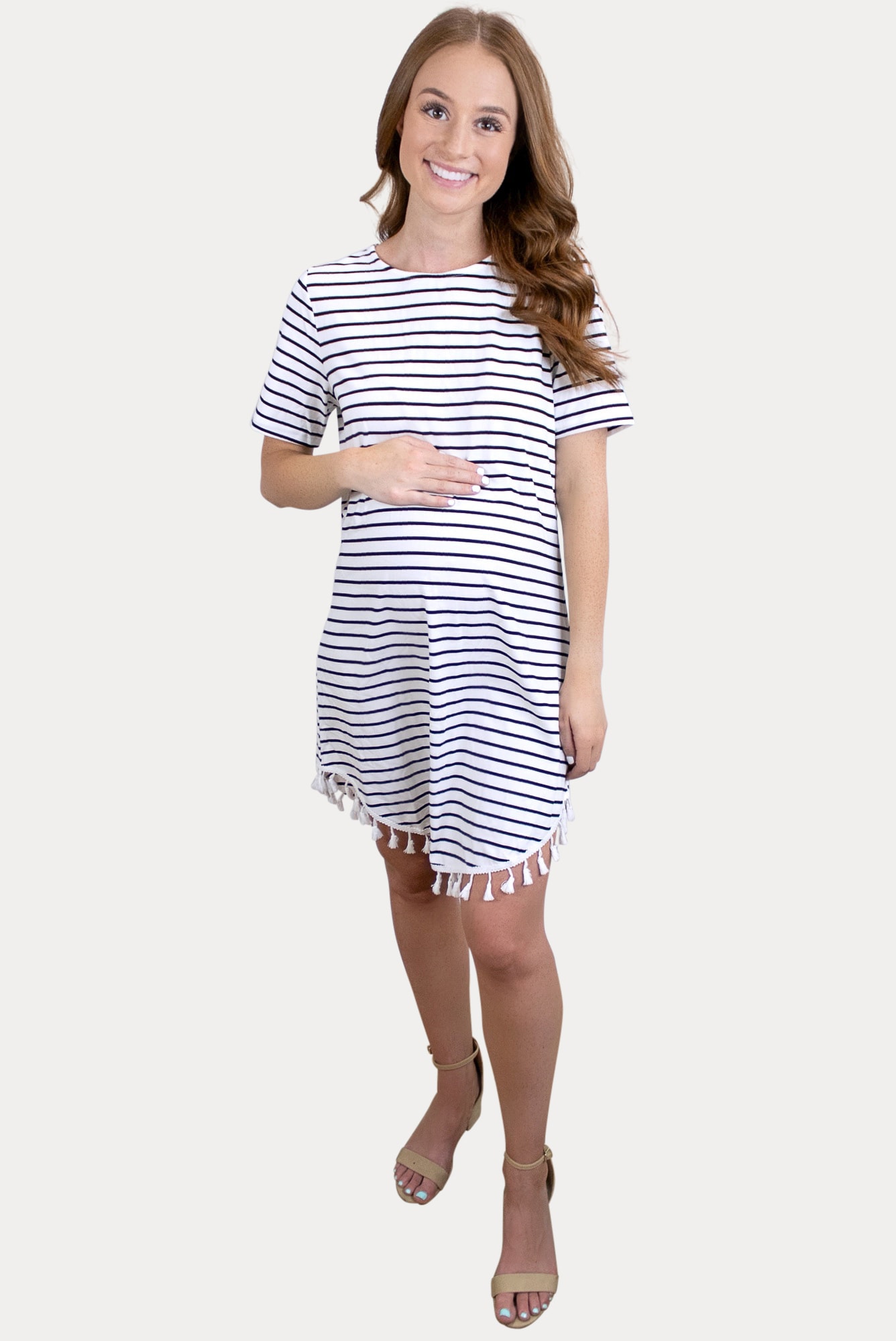 This pregnancy dress with stripes was born to be in your wardrobe! Features a relaxed fit and fun tassel detailing around the bottom. Throw on your favorite pair of tennis shoes for a quick and cute outfit. Perfect throughout pregnancy and beyond!