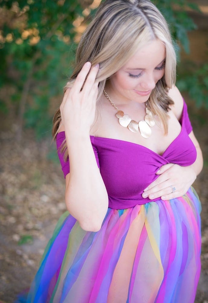 Our Short-Sleeve Off the Shoulder Rainbow Baby Gown is the perfect photoshoot maternity gown! With a cross over sweetheart bust, a slim fit bodice, a simple flare, and a full rainbow bodice overlay this gown has a complete wow factor. (Pictured in Magenta)