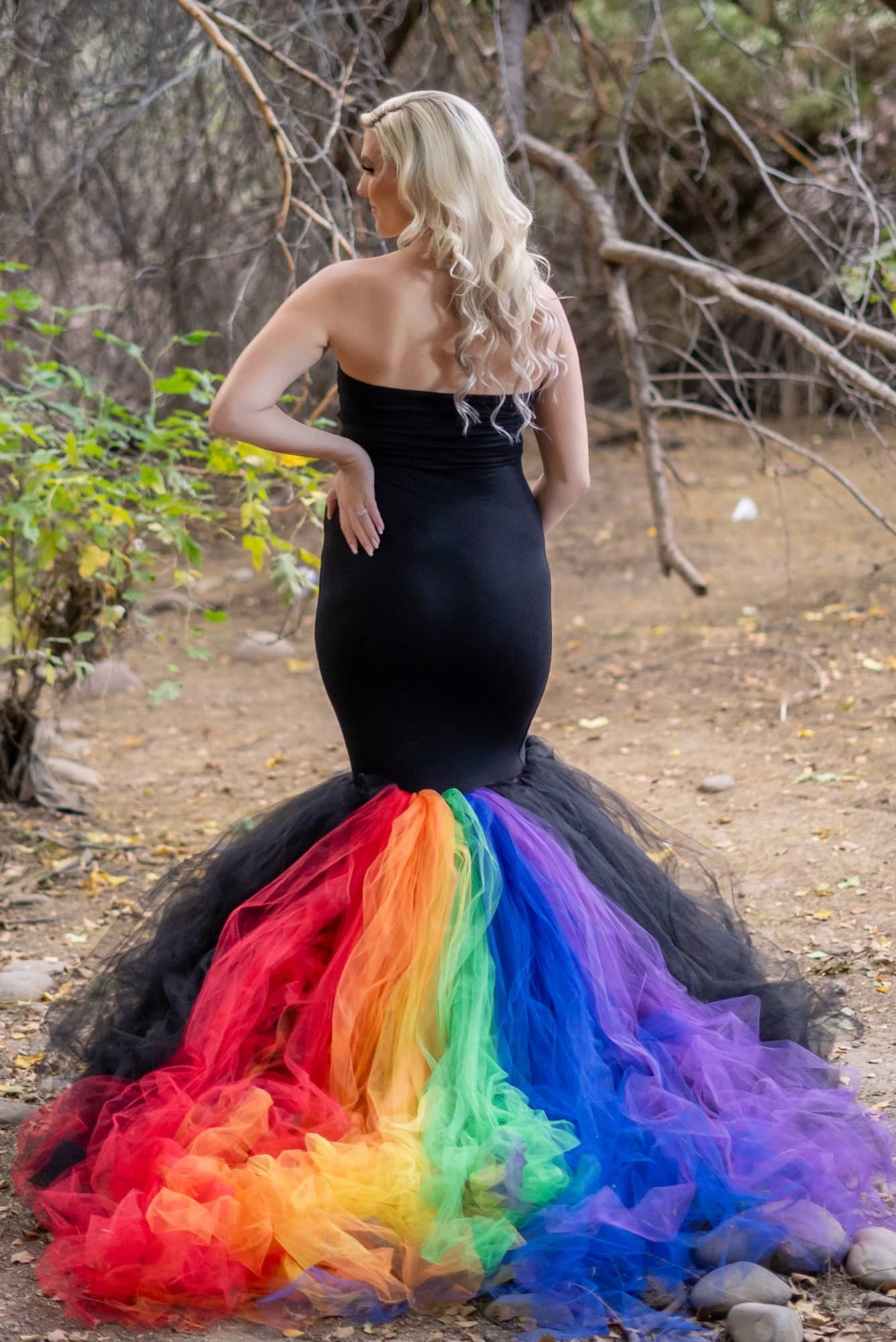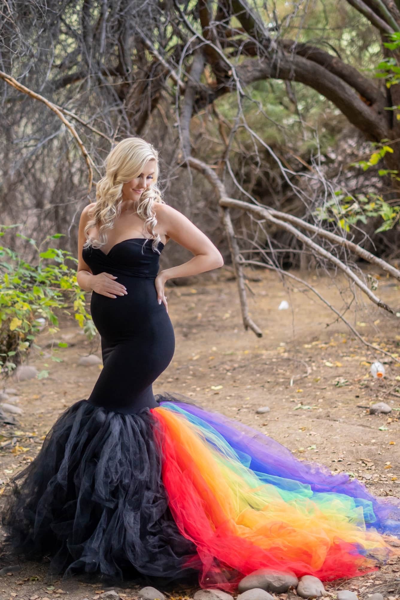 This rainbow train tulle gown is absolutely stunning! It features an elegant strapless sweetheart neckline with an added rainbow twist. We’ve constructed this mermaid style maternity gown with a premium stretch material on the bodice as well as a handcrafted tulle bottom with long rainbow train. It is perfect for a rainbow baby maternity shoot, gender reveal or any special occasion!