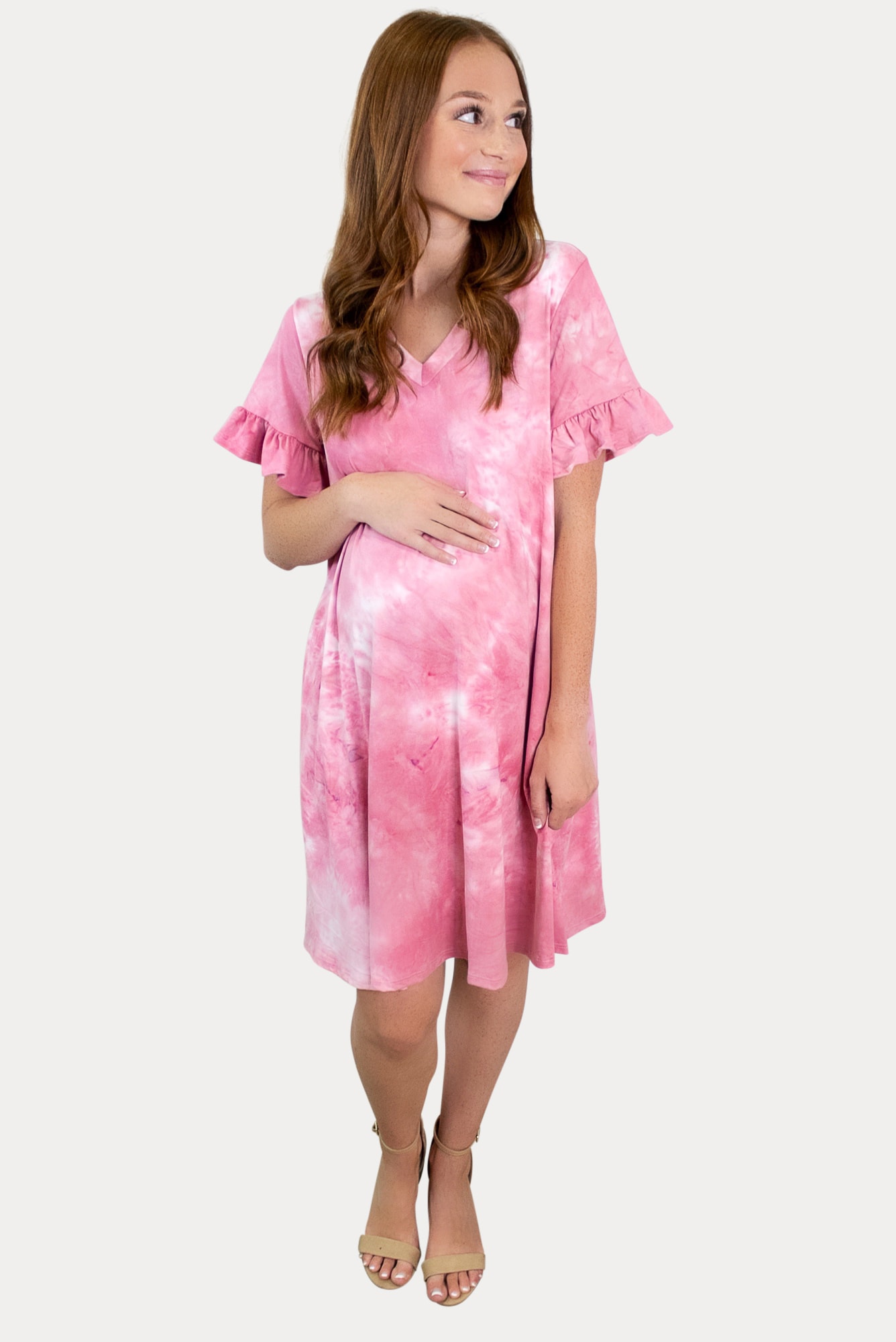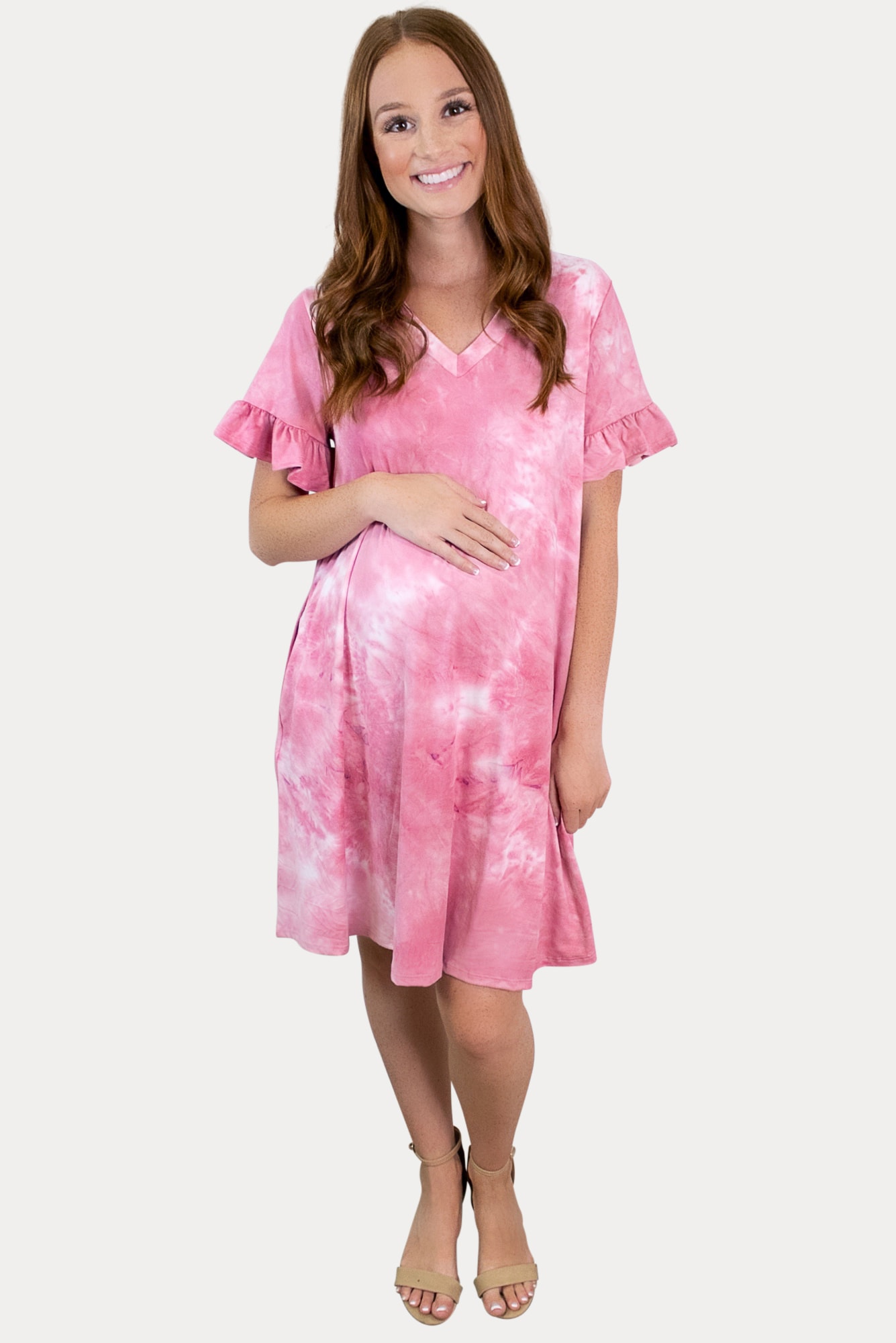 This ruffle tie dye maternity dress is the perfect addition to your summer style, or baby shower! Features a fun and free pink tie dye pattern, and ruffle detailing on the sleeves! With super soft fabric, this dress is the ultimate blend of comfort and style. The relaxed fit is ideal for a growing bump. Perfect throughout all nine months of pregnancy and beyond.