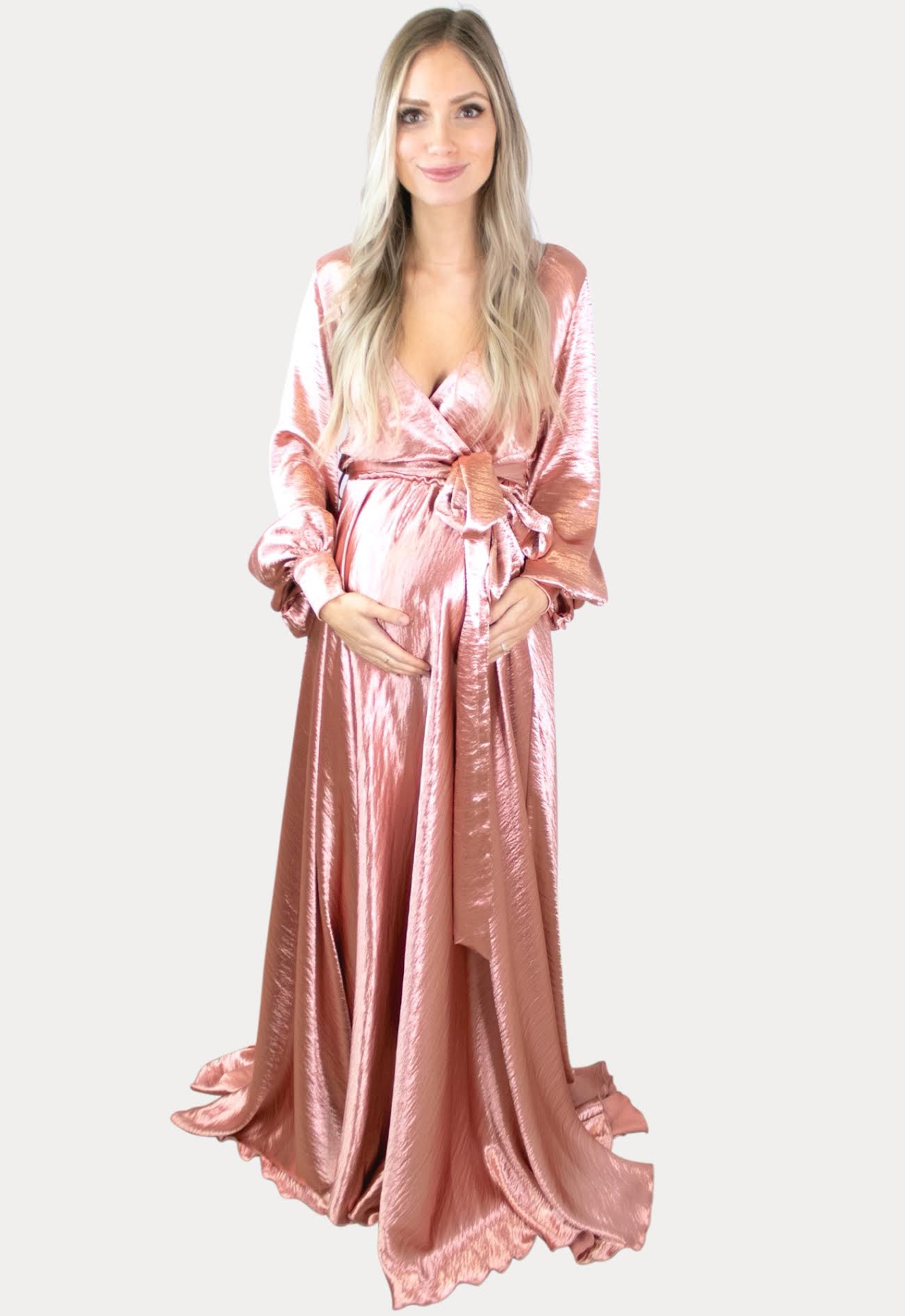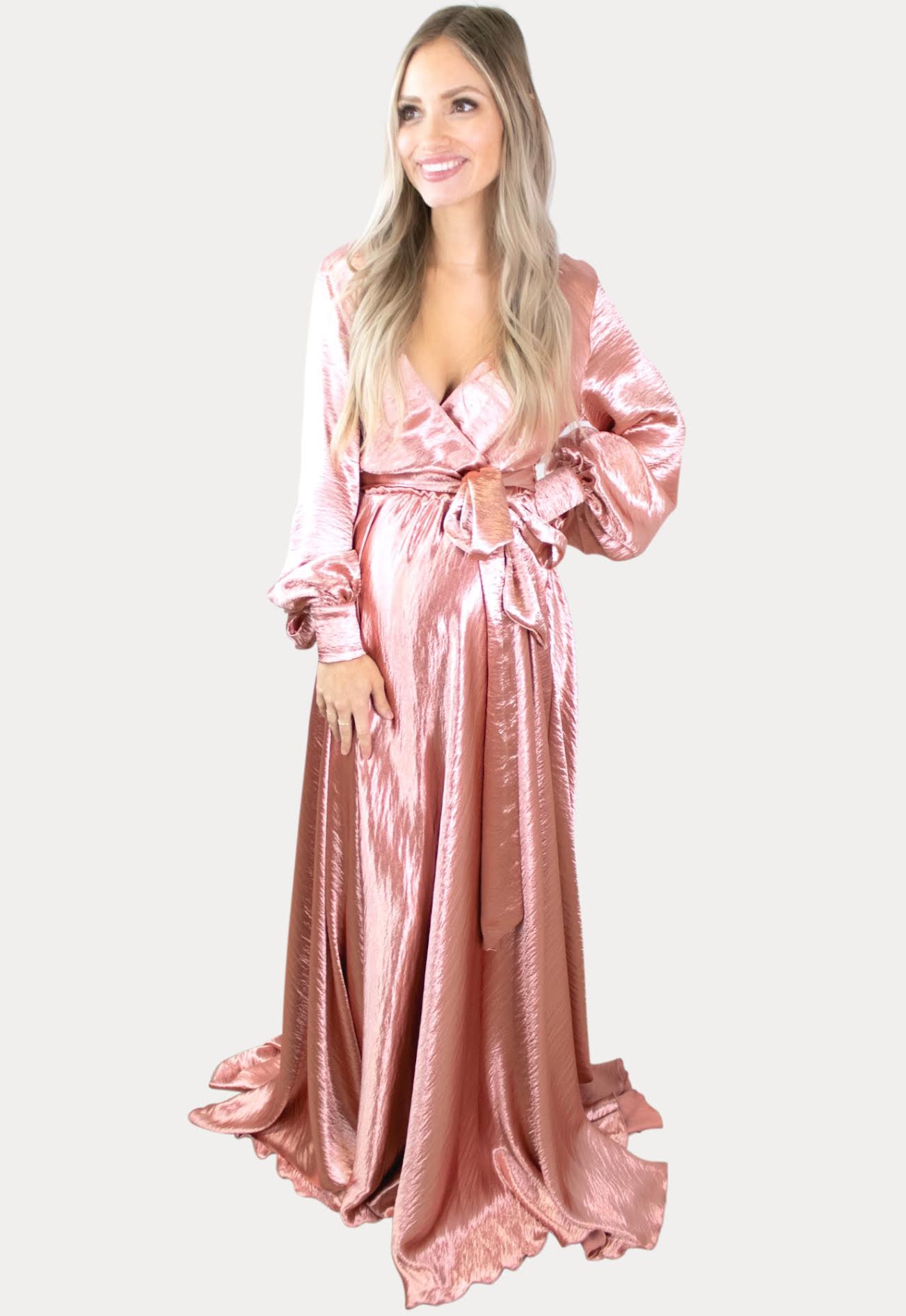 Our satin maternity dress with a sweetheart neckline is stunning and beautiful! With long, bishop sleeves, and tie front waist, this dress is sure to flatter every mama-to-be in the prettiest pink. Made of a delicate satin-like fabric, you’re sure to feel absolutely stunning! The light reflecting fabric is perfect for baby showers, a photoshoot, special occasion, or date night! This elegant sweetheart pregnancy maxi is perfect throughout all nine months of pregnancy and beyond.
