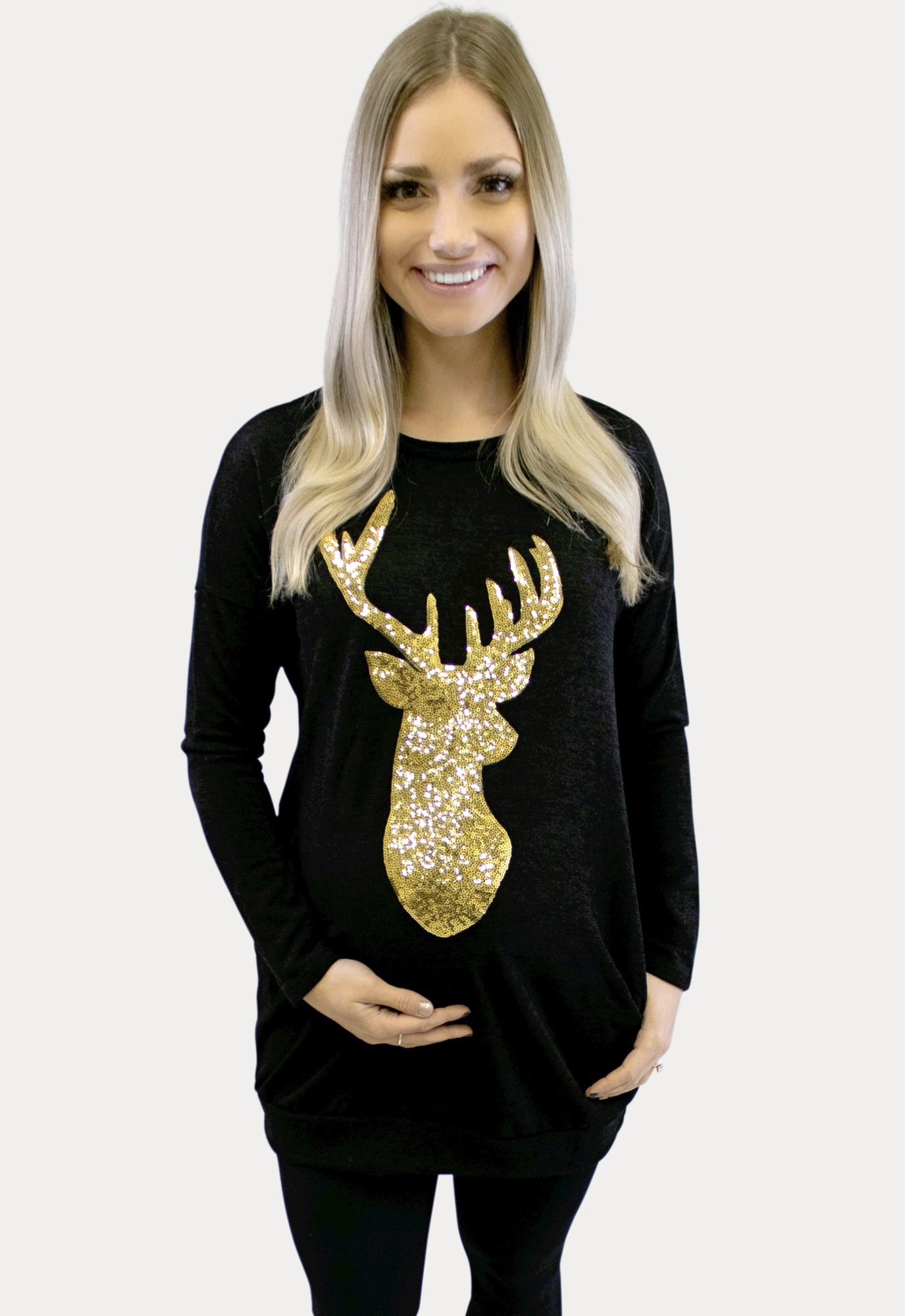 This lightweight sequin reindeer maternity sweater is guaranteed to keep you off the naughty list! It features an adorable sequin reindeer accent and pockets to stash away all the candy canes! A little extra length and ruched sides make it perfect for a growing bump. Pairs perfectly with any Sexy Mama jeans and some booties. This lightweight reindeer maternity sweater is a standout at any holiday party! Perfect throughout all nine months of pregnancy and beyond.