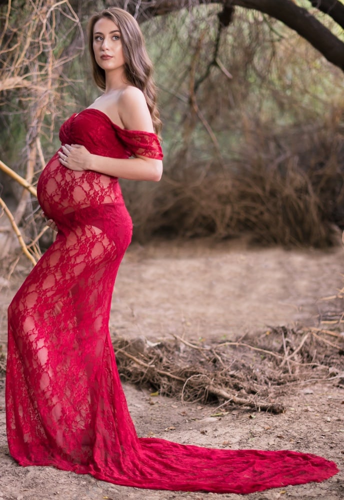 This Sweetheart Sheer Lace Gown with Train is a sexy maternity gown that will have all attention on you and your bump. This dress is a premium stretch lace and is specifically for maternity photoshoots and boudoir. The sweetheart neckline is lace, with a stretch lining in the bust area. It has beautiful drop-sleeves for a touch of elegance. Celebrate your baby bump in pictures to treasure for a lifetime! (Pictured in Red.)