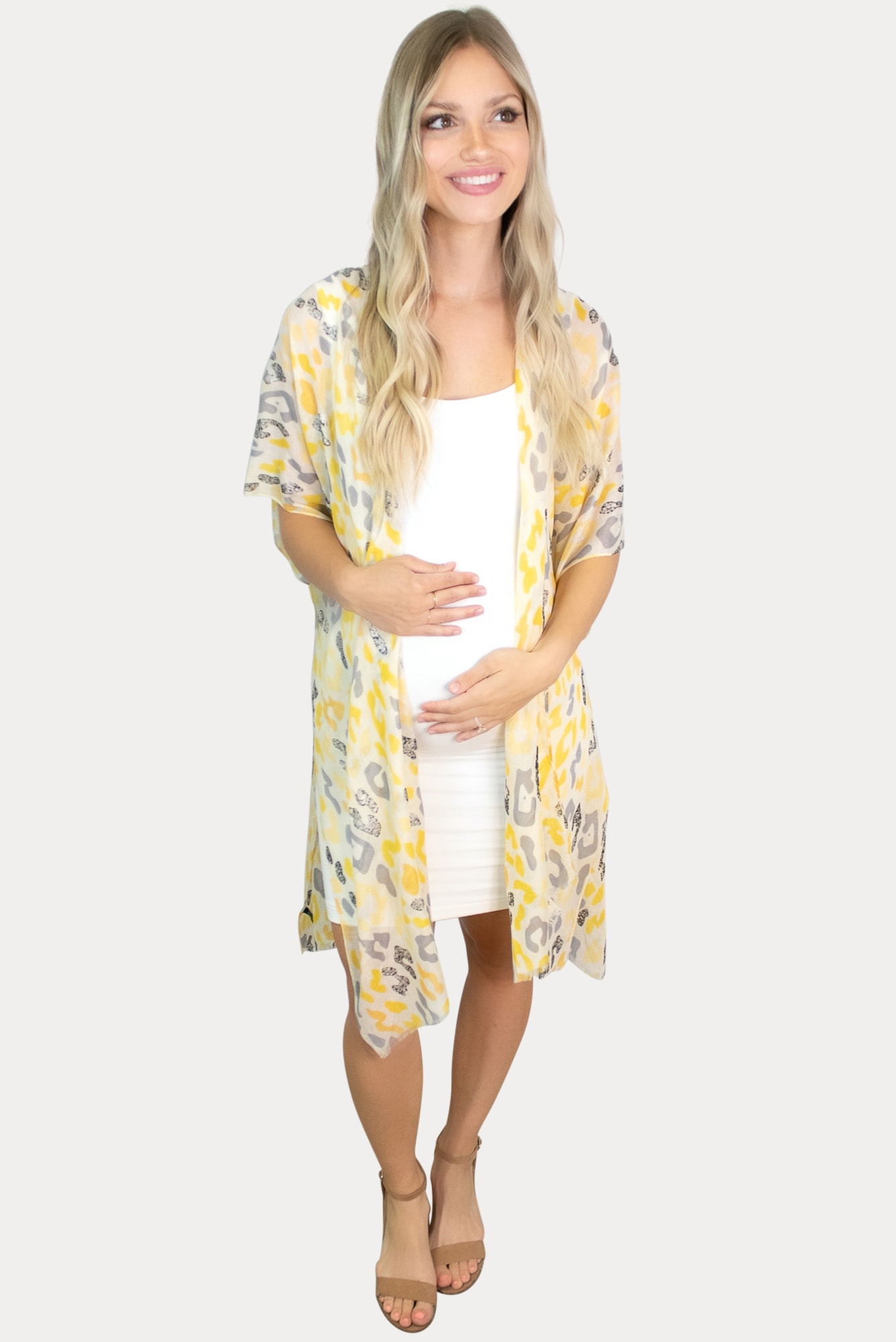 Our sheer leopard maternity kimono in yellow is a flattering layer every mama needs! Features an ultra lightweight material, short sleeves and a trendy leopard print in bright yellow. What more could a mama want? Pairs perfectly with Sexy Mama denim and dresses. And even better, the sheer leopard maternity kimono can be worn throughout all nine months of pregnancy and beyond!