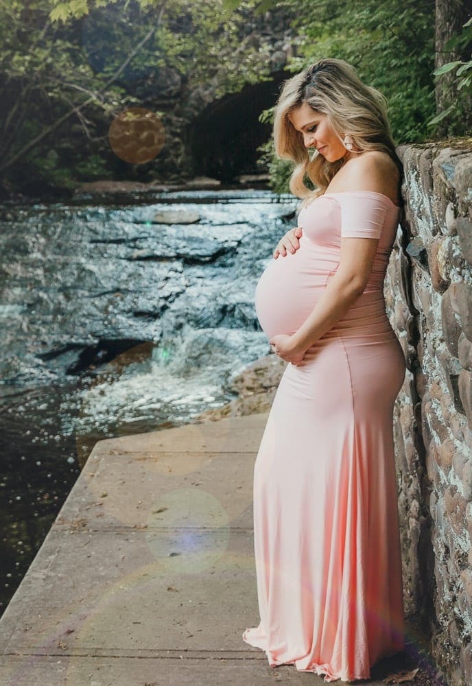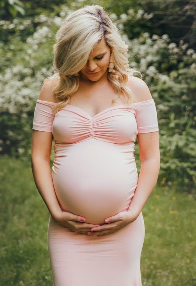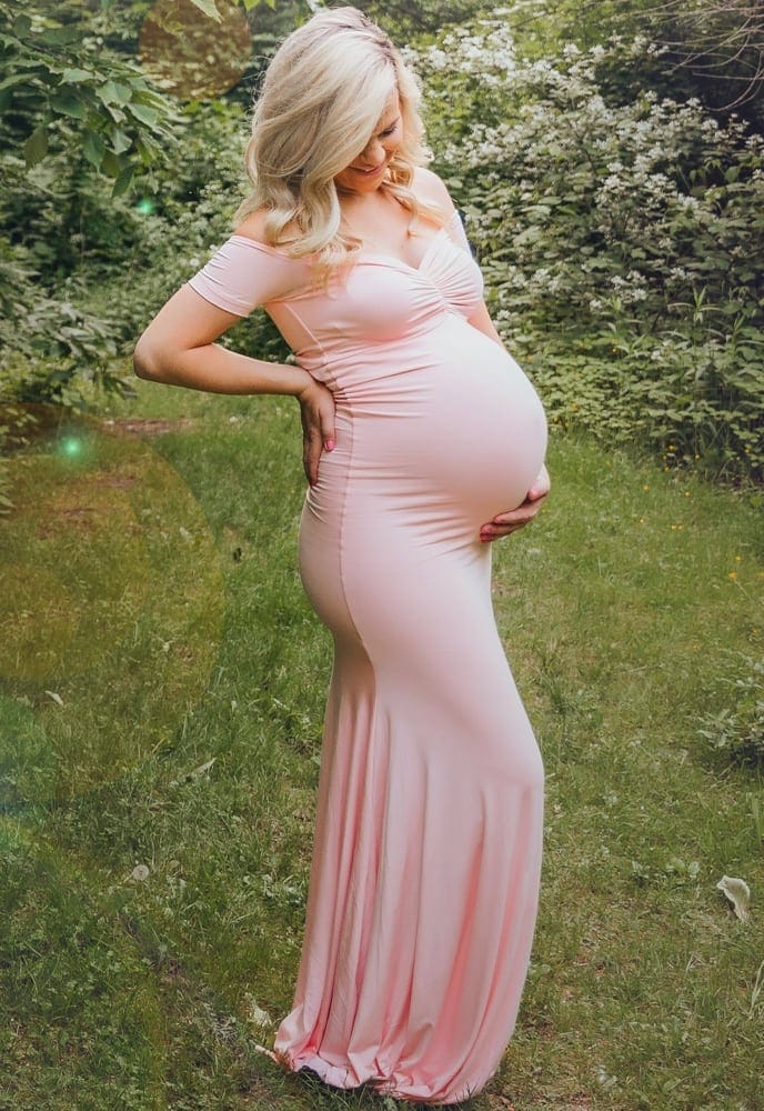 Our Short Sleeve Baby Shower Gown is perfect for your maternity photoshoot or special event! With a flared bottom that hits the ground, a slim fit bodice, and a flattering premium stretch material, this gown is equal parts comfort and elegance. It is the perfect maternity gown for your baby shower or any special event. (Pictured in Blush Pink.)