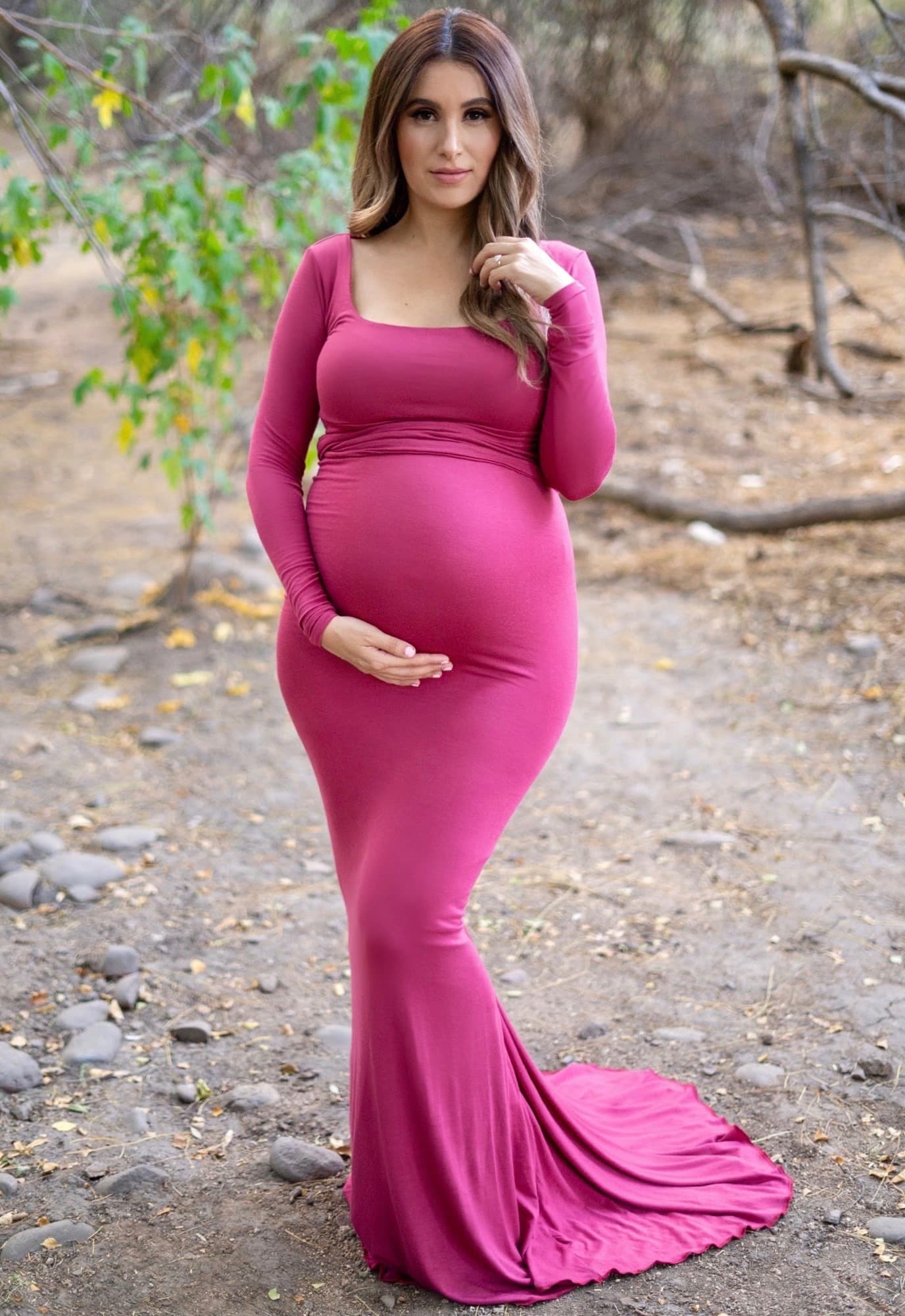 This simple long sleeve maternity gown is ultra flattering! Featuring a stylish cross bust detail, but also a stunning mini train. Constructed of premium stretch material with a scoop neckline, this gown will having you feeling stylish as well as confident. Perfect for your maternity photoshoot, baby shower, or any special event. (Pictured in Peony.)