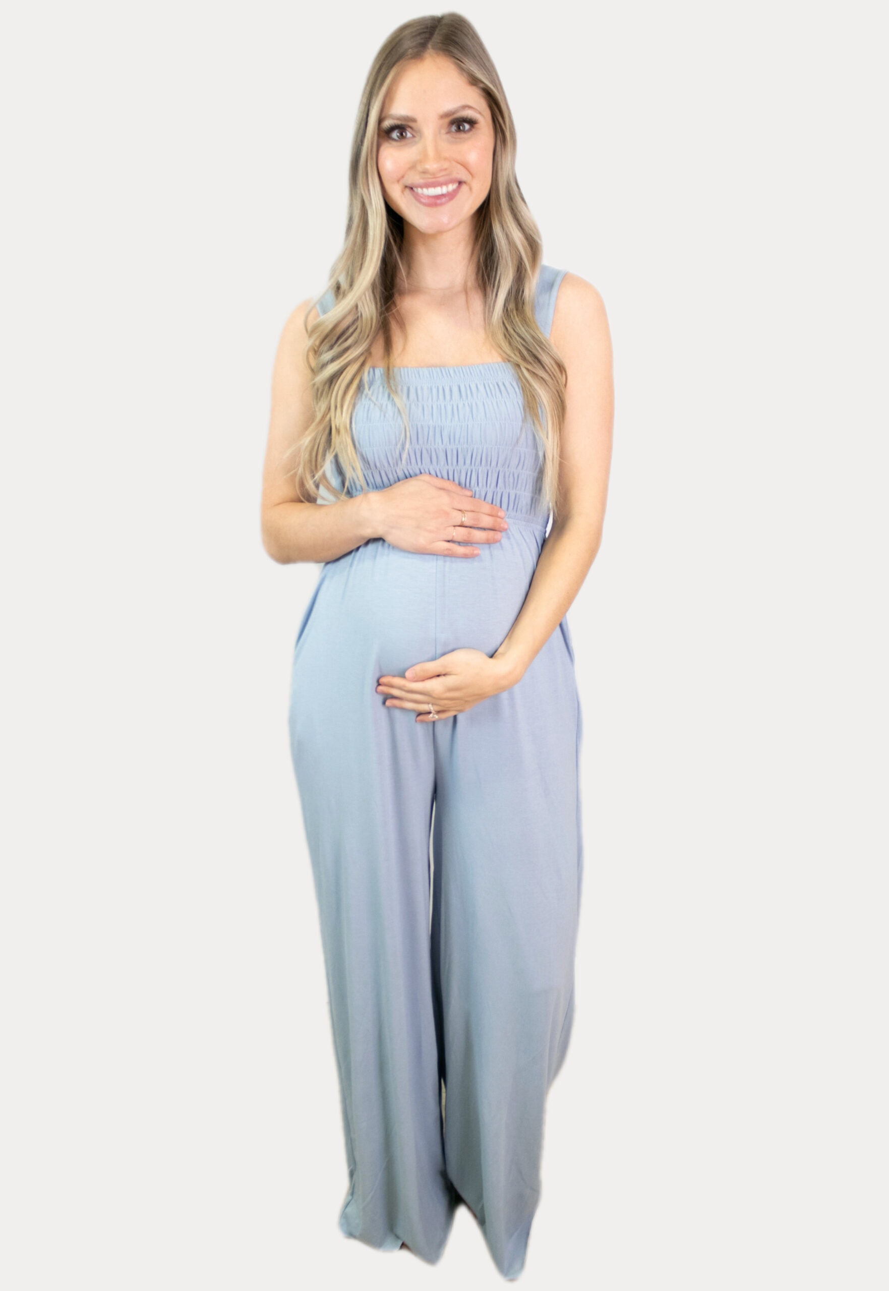 This baby blue maternity jumpsuit was designed with Mama needs in mind! Stylish and so comfortable, it sports thick straps, a smocked top, and a flattering fit. Dress it up or down for a variety of fun looks! Perfect for lounging around the house or even running some errands around town! Designed for wear throughout all nine months of pregnancy and beyond!