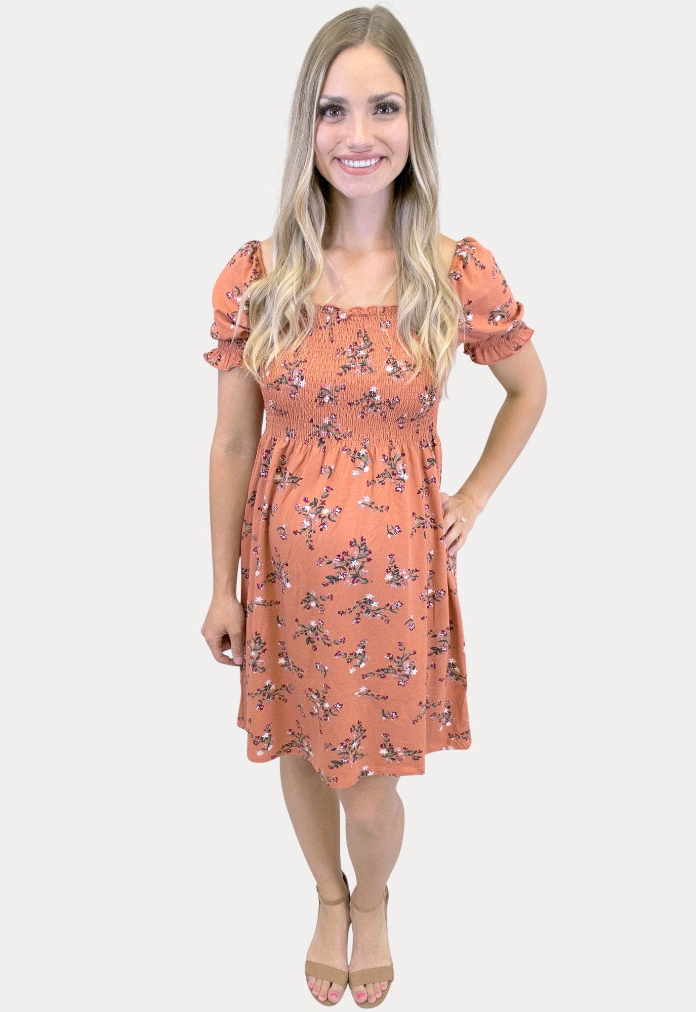 This flattering smock top floral maternity dress is an adorable wardrobe must have! Our dark peach dress features a form fitting top and short sleeves. Designed with a comfortable flowy bottom making this dress perfect for any mama. We know comfort and style is essential for maternity clothes! Ideal to wear throughout pregnancy and beyond.