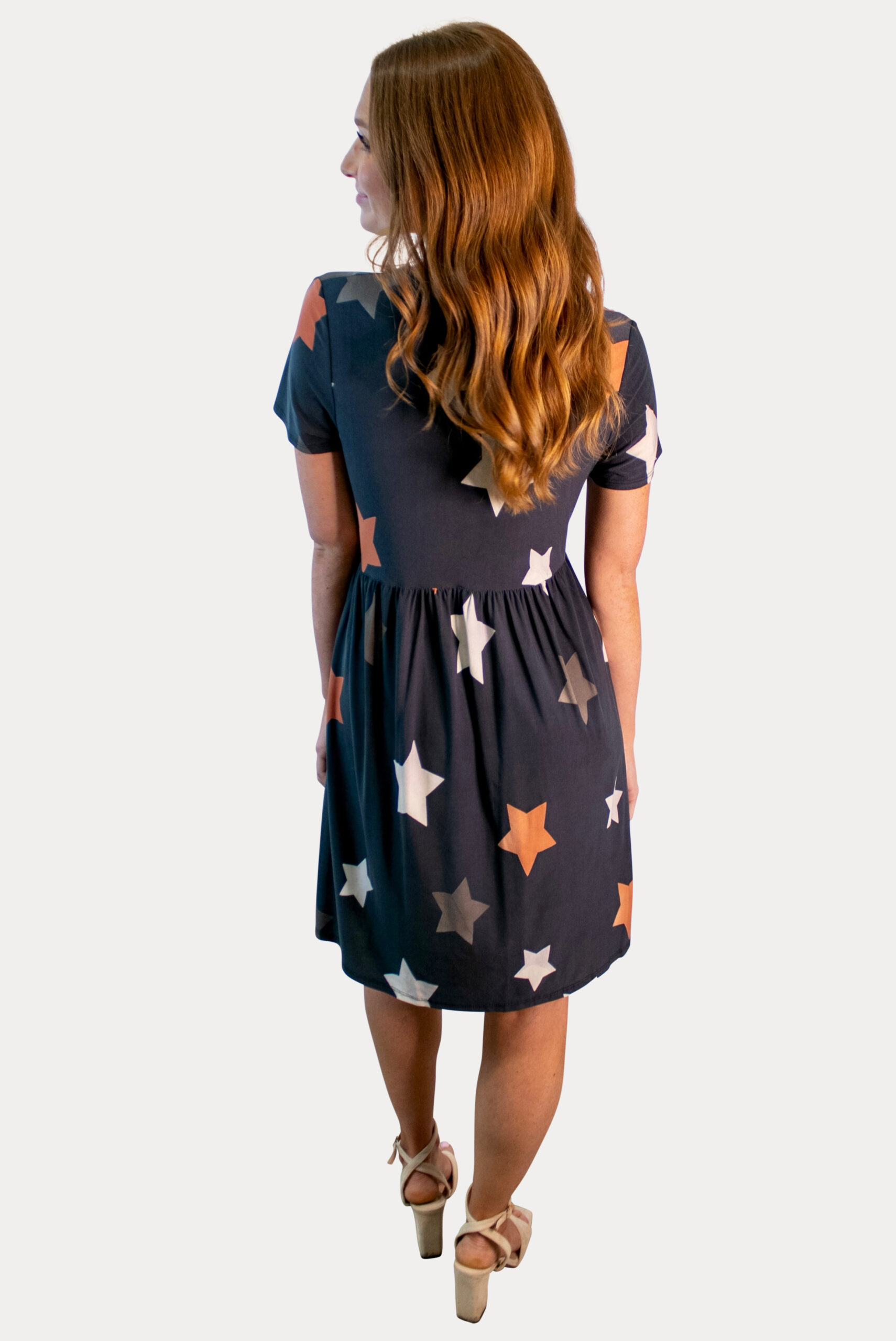Our adorable star pregnancy dress is perfect for your summer activities and more! Features a red white and blue, star pattern and a fun ruffle neckline. A must have for every mama’s wardrobe! Perfect for all nine months of pregnancy and beyond.