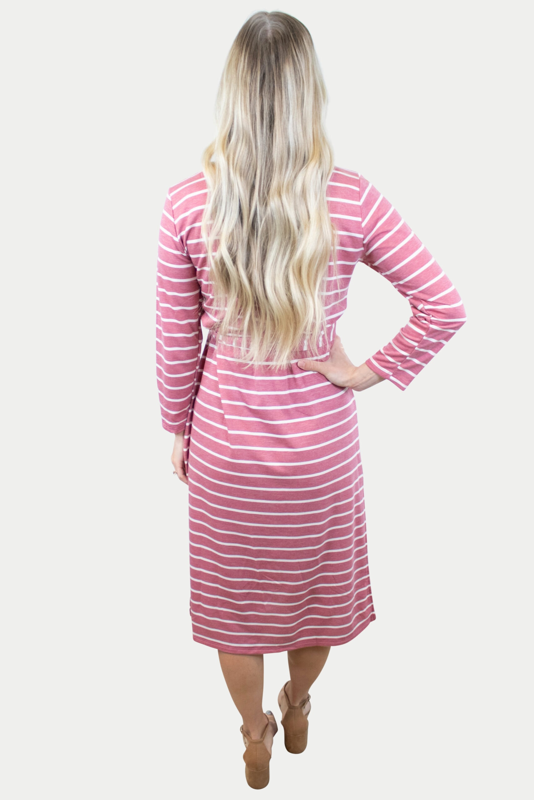 A perfect cool weather dress! Our striped maternity dress with slits is cozy and flattering. It’s ultra-soft and oh so cute. Pair with your favorite booties or heels or for a more casual look throw on your favorite sneakers. Features pink and white stripes with a tie front to keep you stylish and comfortable. This striped maternity dress with slits is perfect for all nine months of pregnancy and beyond.
