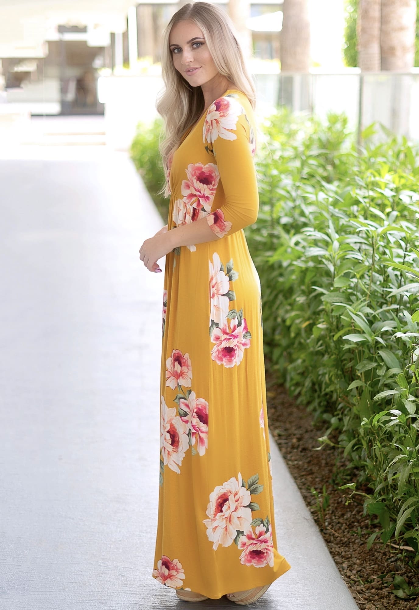 Add a little floral charm to your wardrobe with the perfect sweetheart floral maxi. Features a gorgeous mustard color with a large floral print. The sweetheart neckline is so flattering! An ideal floral date night dress or just because.
