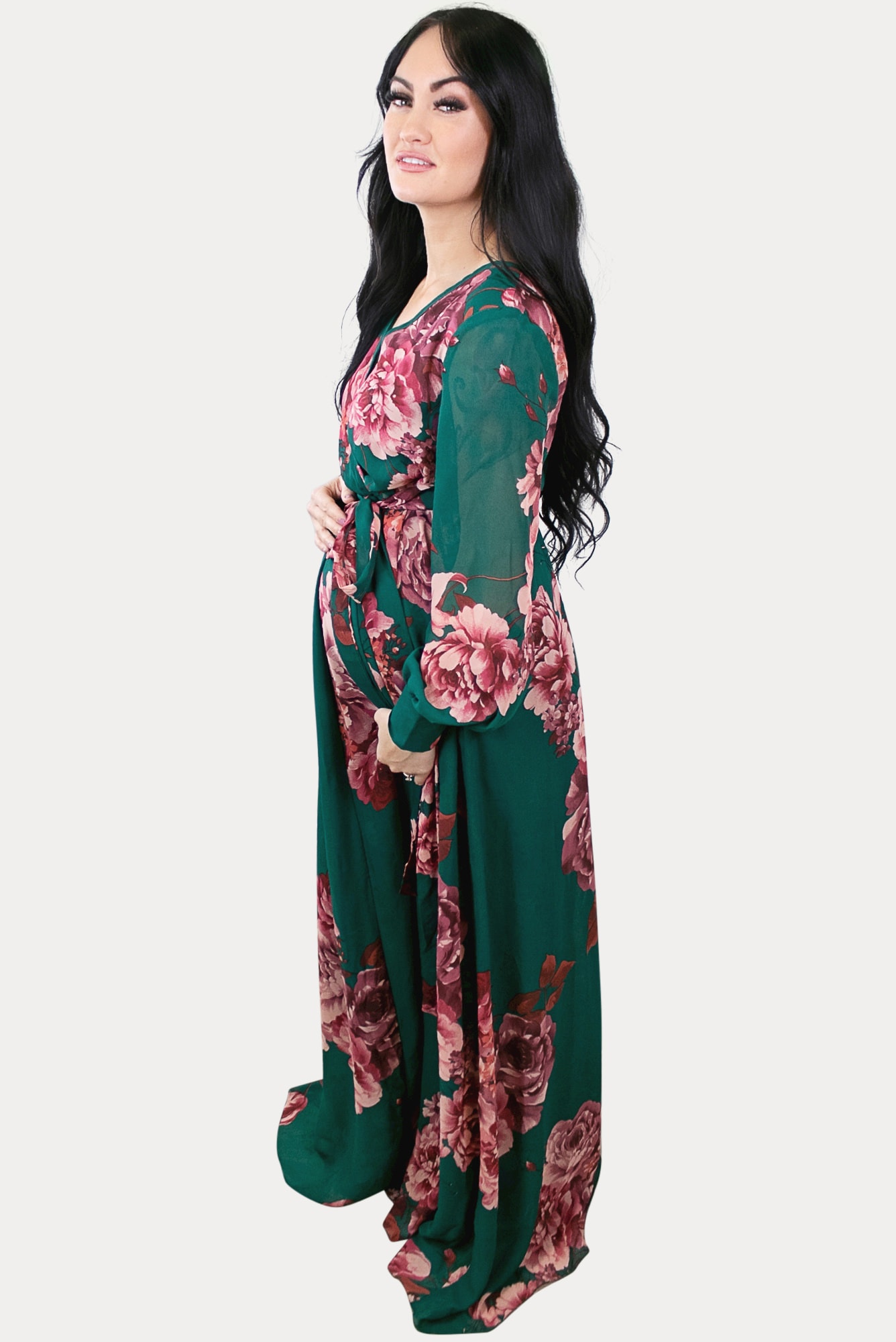 This is the perfect sweetheart floral pregnancy maxi. Features a gorgeous Emerald Green color with a large floral print. The sweetheart neckline is perfect for nursing, long loose sleeves, and a tie waistline to keep you comfy! An ideal floral baby shower maxi, date night dress, or just because. Designed for wear throughout all nine months of pregnancy and beyond!