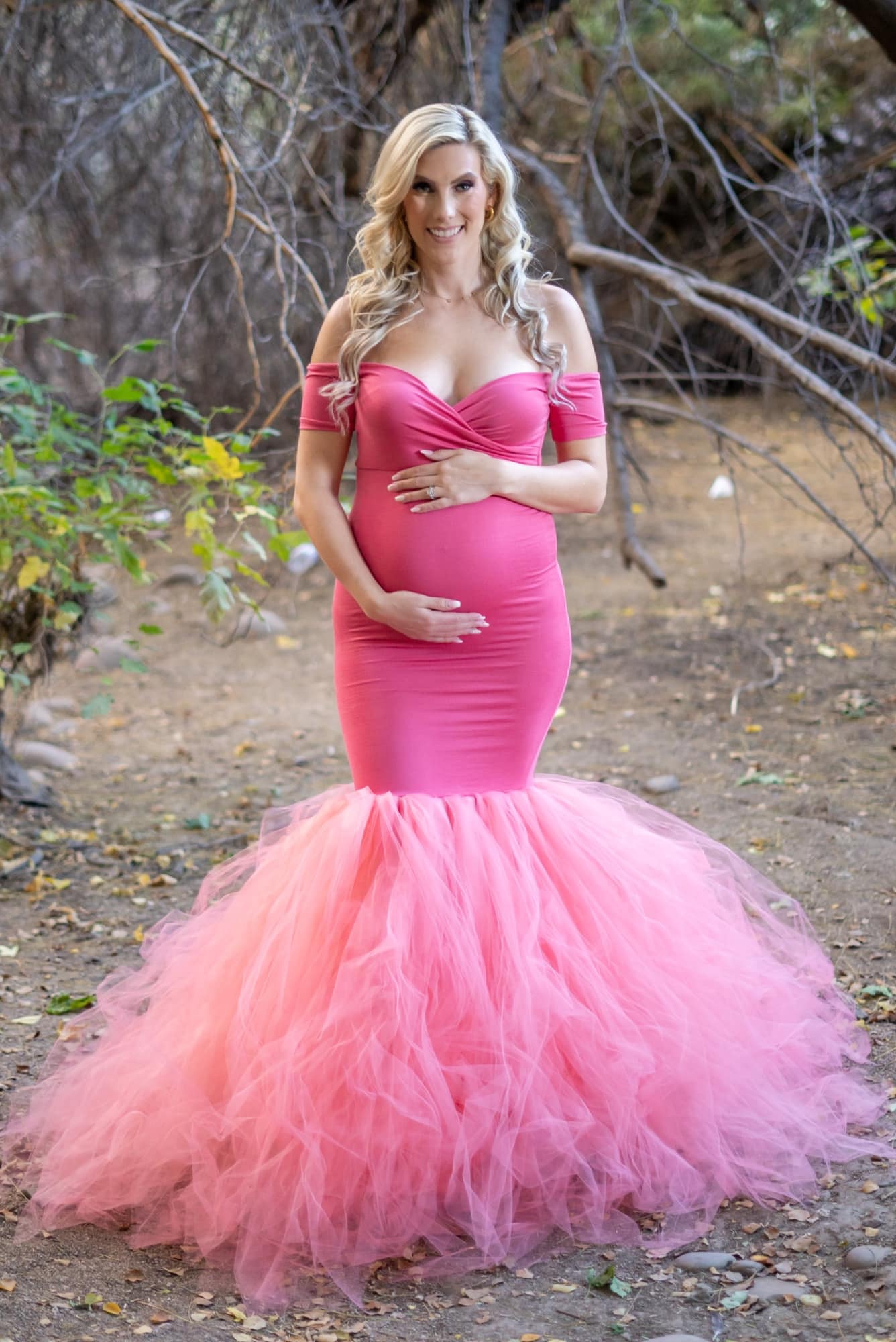 Our Off-the-Shoulder Sweetheart Tulle Gown with train is absolutely stunning! It’s a sweetheart maternity gown constructed of premium stretch material on the bodice with a handcrafted tulle bottom. This gown is pure elegance from top to bottom, and is perfect for your maternity photoshoot or special occasion.