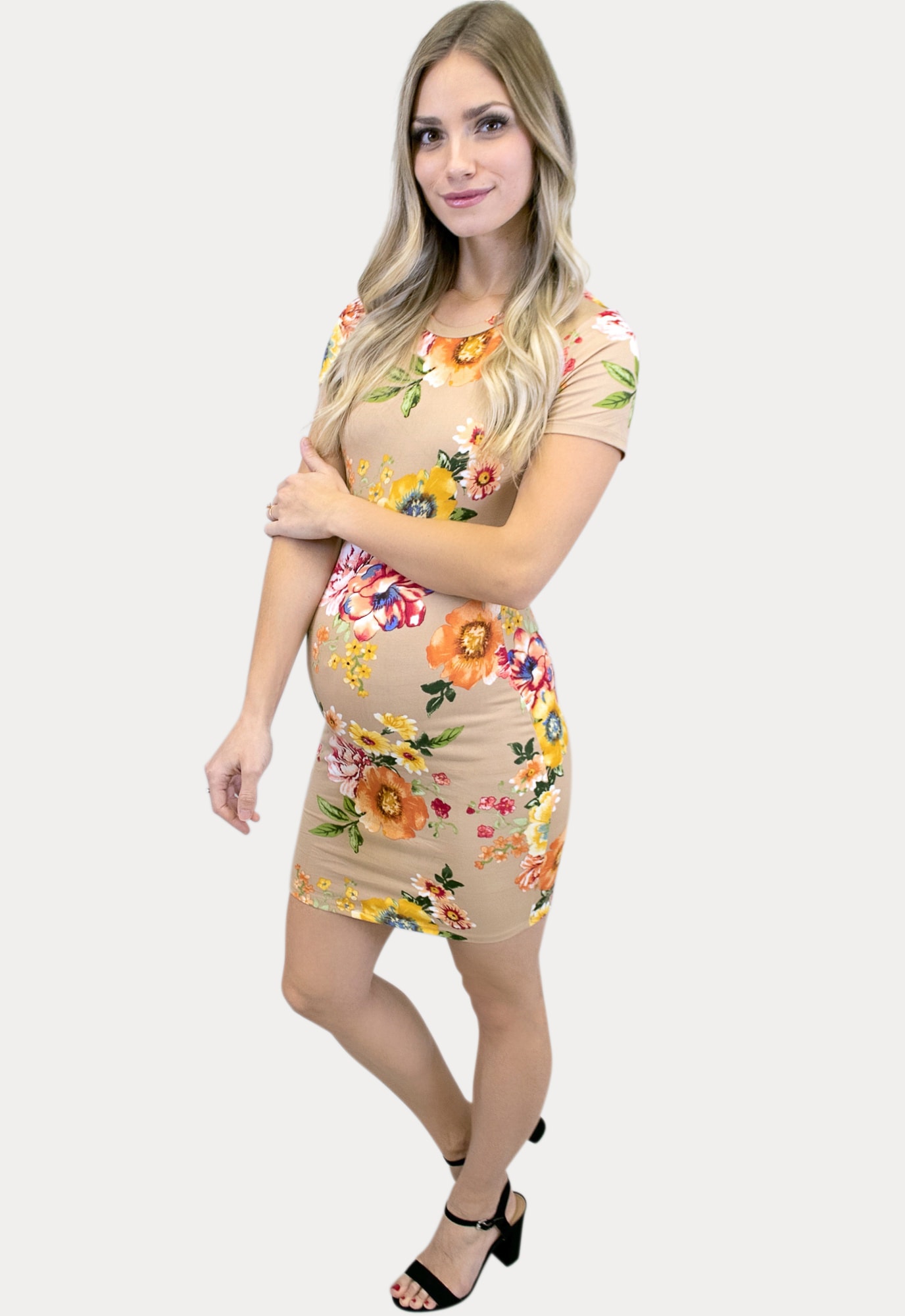 All eyes will be on you in our tan, floral maternity dress that features a gorgeous and bright floral pattern! Designed with short sleeves, and a super soft fabric, it is the perfect blend of comfort and style! Sophisticated fun and a form fitting fit to flatter all your mama curves. This is more than a maternity dress as it is perfect to wear throughout all nine months of pregnancy and beyond.