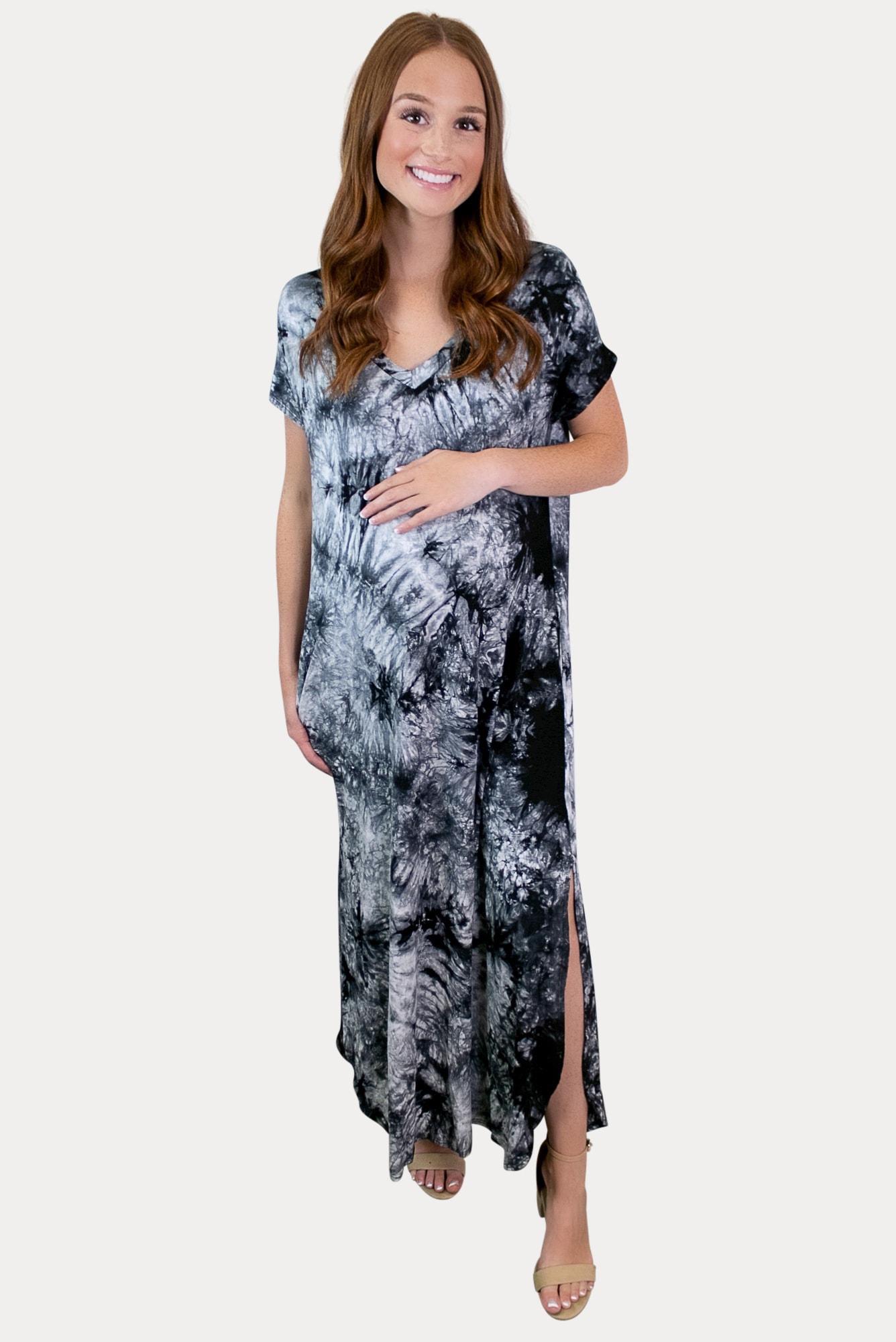 This dress is guarantees to keep you on trend! Our tie dye pregnancy maxi dress features, shorts sleeves, and a relaxed fit ideal for a growing bump. The ultimate combination of style and comfort! Dress this fun black and grey tie dye print dress up with a pair of heels or down with some classic sneakers. Perfect throughout all nine months of pregnancy and beyond.