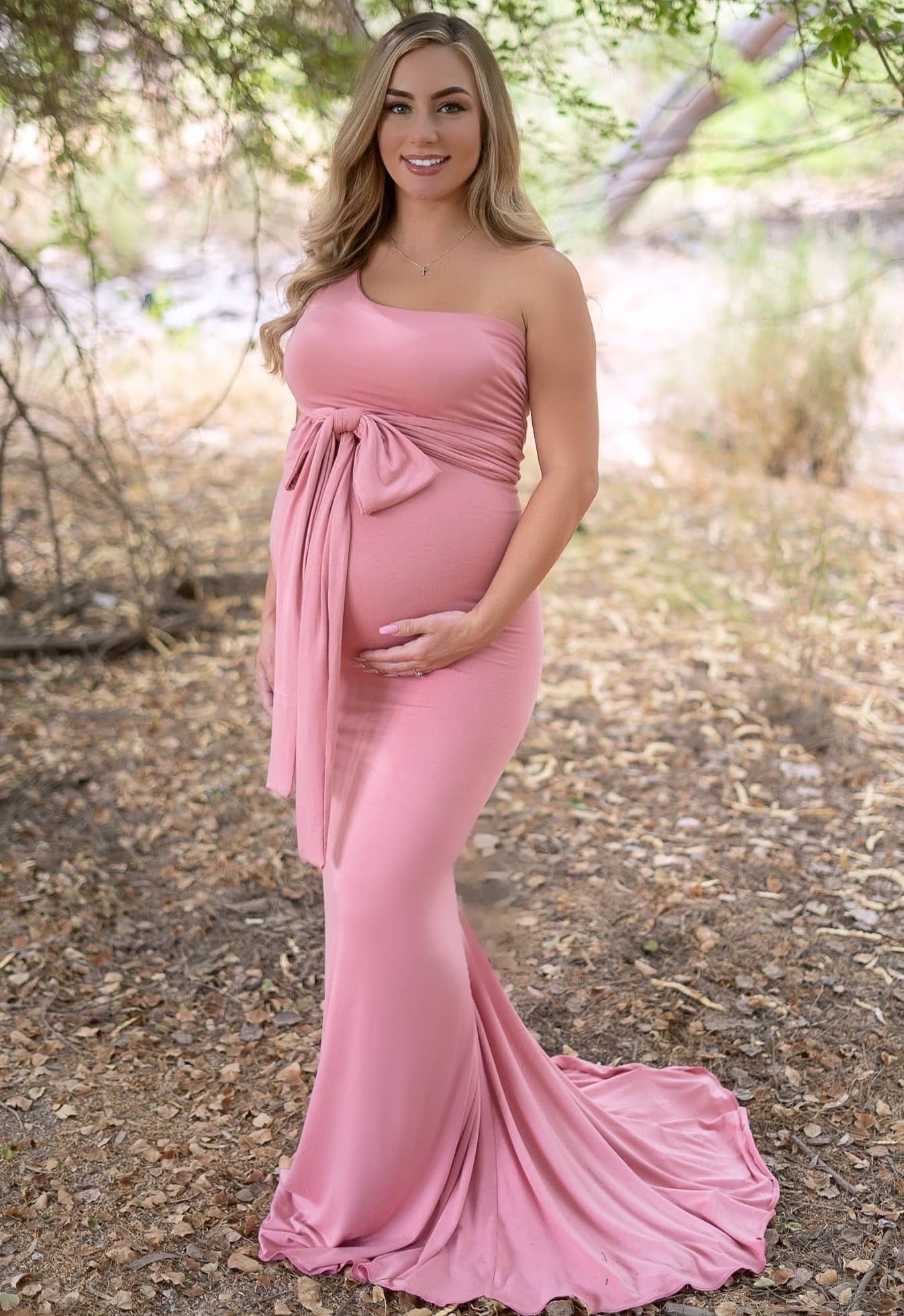 Our flattering one shoulder maternity gown with a mini train is gown perfection! Constructed of premium stretch material which will flatter every Mama. Features a flattering tie front detail and a stunning one shoulder top. Perfect for your indoor or outdoor photoshoot, bridal party, or any special event!