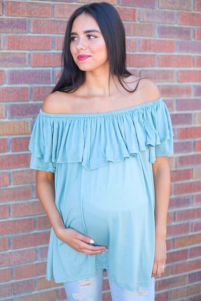 Go with the flow! This off the shoulder trendy maternity top is flattering and super comfortable! Features a ruffled detail with short sleeves. Elastic around the entire top will keep your shirt in place while you go about your day to day tasks. Perfect for a variety of looks and pairs well with any Sexy Mama jeans or leggings!