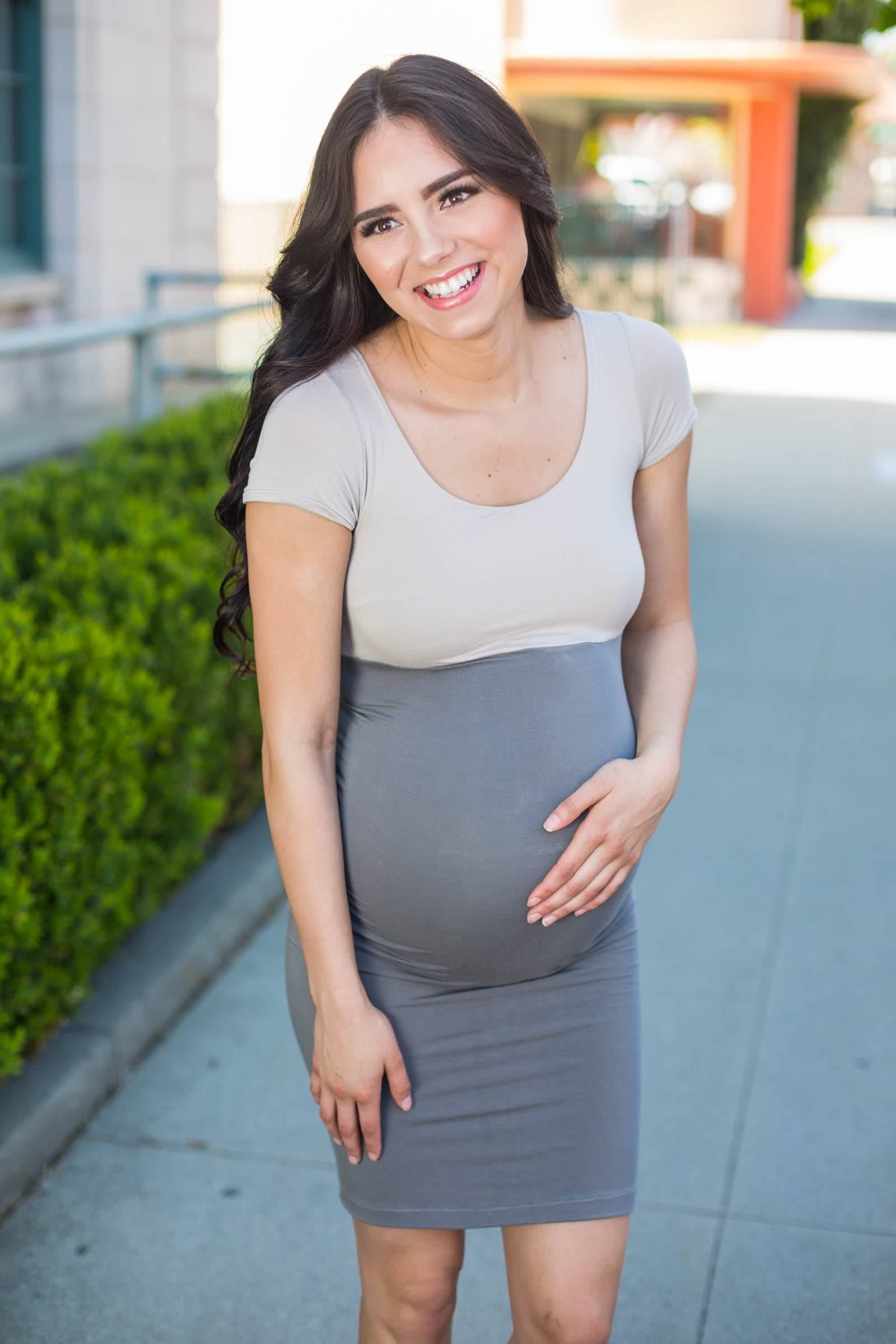 Our Two-Tone Dress with Mini Sleeves is the softest and sexiest short-sleeve bodycon maternity dress on the market. This dress checks all the boxes by being sexy, comfortable, stylish and sophisticated all at the same time. The two-tone combo adds a unique element to the typical monochromatic bodycon dress. It flatters your upper body and baby bump by accentuating where bump meets bust. The Two-Tone Dress with Mini Sleeves is constructed of our ultra-soft, stretch material designed specifically with Mama curves in mind that will flatter throughout pregnancy and beyond.