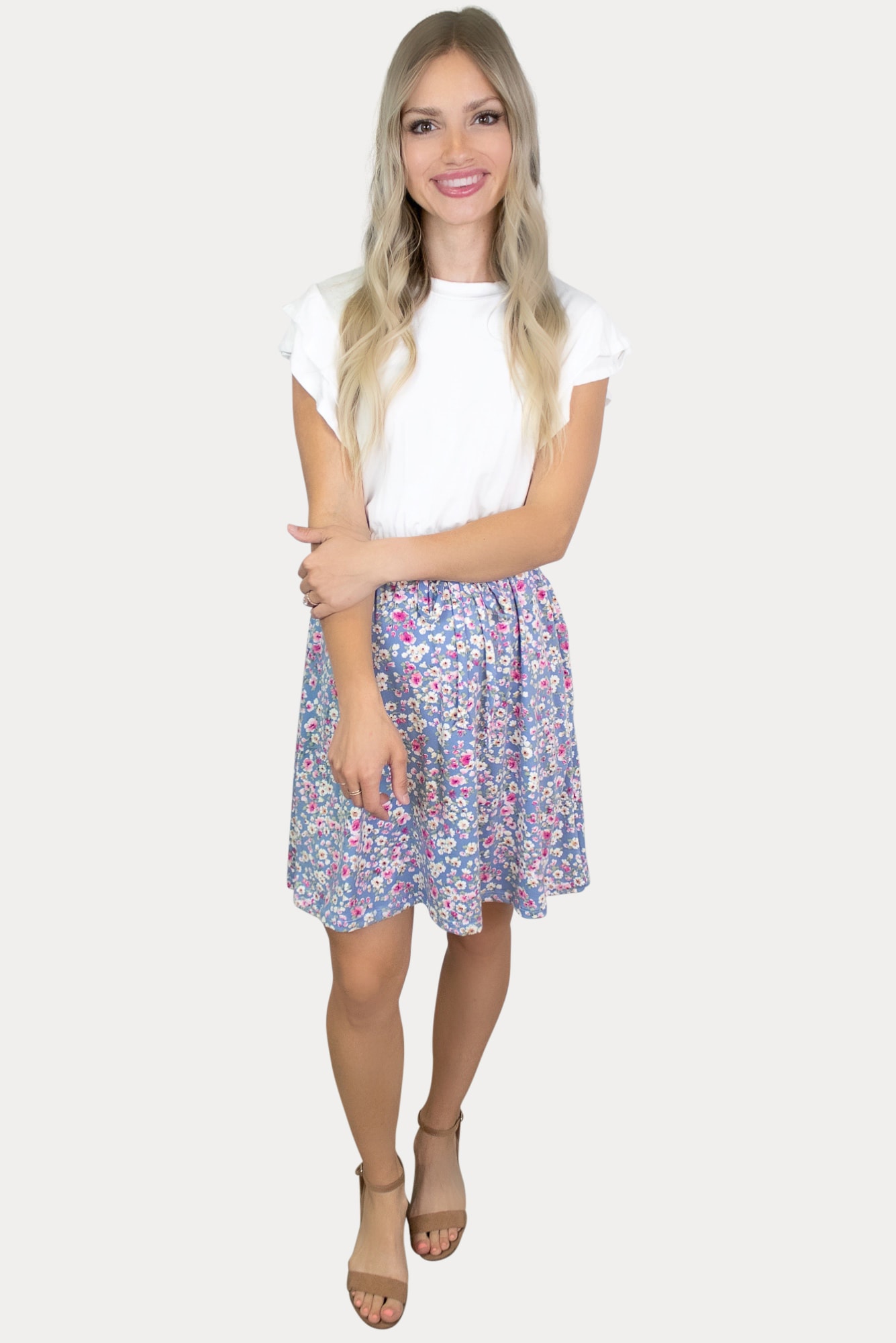 This gorgeous blue two tone maternity dress was born to be in your wardrobe! Comfy on top with ruffles, and blue flowy floral on the bottom, this dress is great for any mama. You can’t go wrong with this white and floral combo. It’s the perfect dress for a quick, cute outfit. Perfect throughout all nine months of pregnancy and beyond!