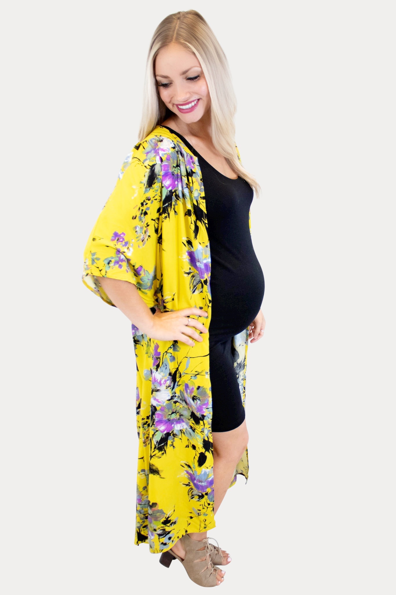 The perfect yellow maternity kimono with flowers has arrived to make your outfit pop! This super soft, lightweight maternity kimono is a layering essential. Because it’s so cozy you won’t want to take it off! It’s yellow with a gorgeous floral pattern, short-sleeves and an open front. Pairs perfectly with denim, dresses, and is perfect to complete your baby shower look. And a total win to wear throughout pregnancy and beyond.