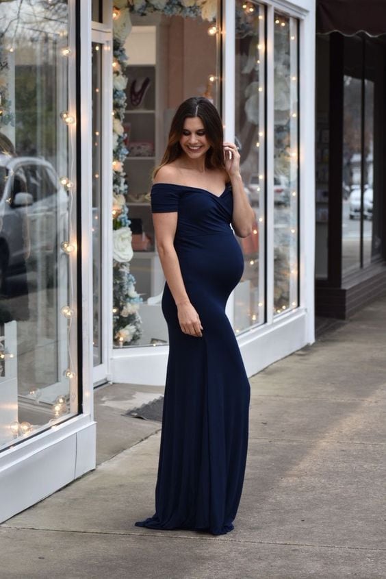 Baby showers, but also formal parties and weddings! This gown, pictured in Navy Blue, is perfect for any event or gathering where you need one of our formal maternity dresses!